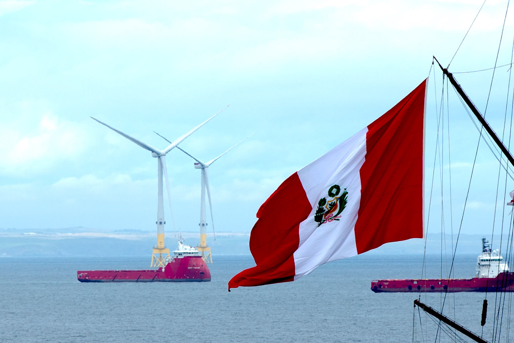 A lone tall ship slips past Aberdeen’s offshore wind turbines, sails meeting steel, while oilfield supply vessels watch on. Old routes and new energies,