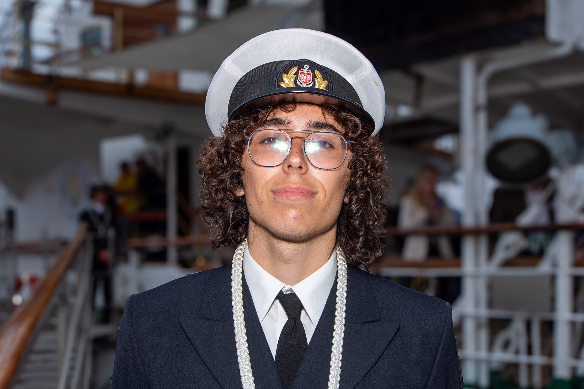 A quiet pause between duties, a crew member stands still for a moment, framed by rope, salt air, and the rhythm of the harbour